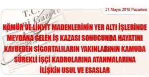 Çalışma ve Sosyal Güvenlik Bakanlığından: KÖMÜR VE LİNYİT MADENLERİNİN YER ALTI İŞLERİNDE MEYDANA GELEN İŞ KAZASI SONUCUNDA HAYATINI KAYBEDEN SİGORTALILARIN YAKINLARININ KAMUDA SÜREKLİ İŞÇİ KADROLARINA