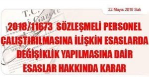 Karar Sayısı : 2018/11673 6.6.1978 tarihli ve 7/15754 sayılı Kararnameye ektir. Ekli “Sözleşmeli Personel Çalıştırılmasına İlişkin Esaslarda Değişiklik Yapılmasına Dair Esaslar”ın yürürlüğe konulması; Maliye Bakanlığının 13.4.2018