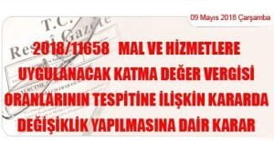 Karar Sayısı : 2018/11658 Ekli “Mal ve Hizmetlere Uygulanacak Katma Değer Vergisi Oranlarının Tespitine İlişkin Kararda Değişiklik Yapılmasına Dair Karar”ın yürürlüğe konulması; Maliye Bakanlığının 9/4/2018 tarihli ve