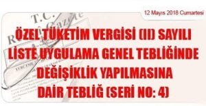 Maliye Bakanlığı (Gelir İdaresi Başkanlığı)’ndan: ÖZEL TÜKETİM VERGİSİ (II) SAYILI LİSTE UYGULAMA GENEL TEBLİĞİNDE DEĞİŞİKLİK YAPILMASINA DAİR TEBLİĞ (SERİ NO: 4) (12 Mayıs 2018