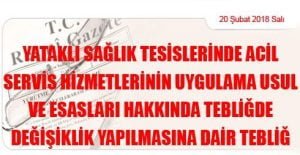 Sağlık Bakanlığından: YATAKLI SAĞLIK TESİSLERİNDE ACİL SERVİS HİZMETLERİNİN UYGULAMA USUL VE ESASLARI HAKKINDA TEBLİĞDE DEĞİŞİKLİK YAPILMASINA DAİR TEBLİĞ (20 Şubat 2018 Tarihli ve 30338 Sayılı