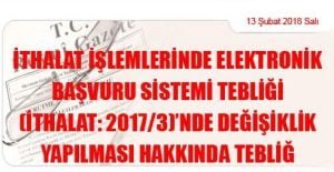 Ekonomi Bakanlığından: İTHALAT İŞLEMLERİNDE ELEKTRONİK BAŞVURU SİSTEMİ TEBLİĞİ (İTHALAT: 2017/3)’NDE DEĞİŞİKLİK YAPILMASI HAKKINDA TEBLİĞ (13 Şubat 2018 Tarihli ve 30331 Sayılı Resmi Gazete’ de Yayımlanmıştır)