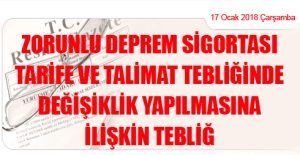 Başbakanlık (Hazine Müsteşarlığı)’tan: ZORUNLU DEPREM SİGORTASI TARİFE VE TALİMAT TEBLİĞİNDE DEĞİŞİKLİK YAPILMASINA İLİŞKİN TEBLİĞ (17 Ocak 2018 Tarihli ve 30304 Sayılı Resmi Gazete’ de