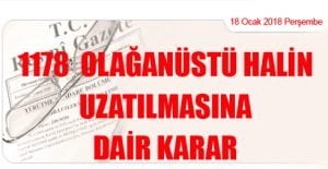 OLAĞANÜSTÜ HALİN UZATILMASINA DAİR KARAR (18 Ocak 2018 Tarihli ve 30305 – 1.Mükerrer Sayılı Resmi Gazete’ de Yayımlanmıştır) Karar No. 1178 Karar Tarihi: