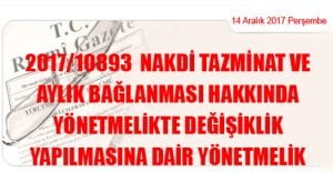 Karar Sayısı : 2017/10893 Ekli “Nakdi Tazminat ve Aylık Bağlanması Hakkında Yönetmelikte Değişiklik Yapılmasına Dair Yönetmeliksin yürürlüğe konulması; Millî Savunma Bakanlığının 8/9/2017 tarihli ve 4282 sayılı yazısı